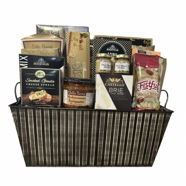 This metal basket is filled with crackers,, focaccia crisp crackers, butter pretzels, crackers, mixed nuts/almonds, brie cheese, salmon, peanuts, almonds, antipesto, toffee peanuts, cheese spread, caramel popcorn, mustard pepperettes brie cheese , gouda cheese and biscotti.